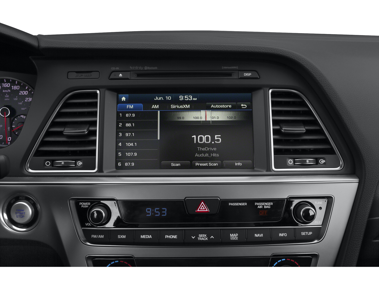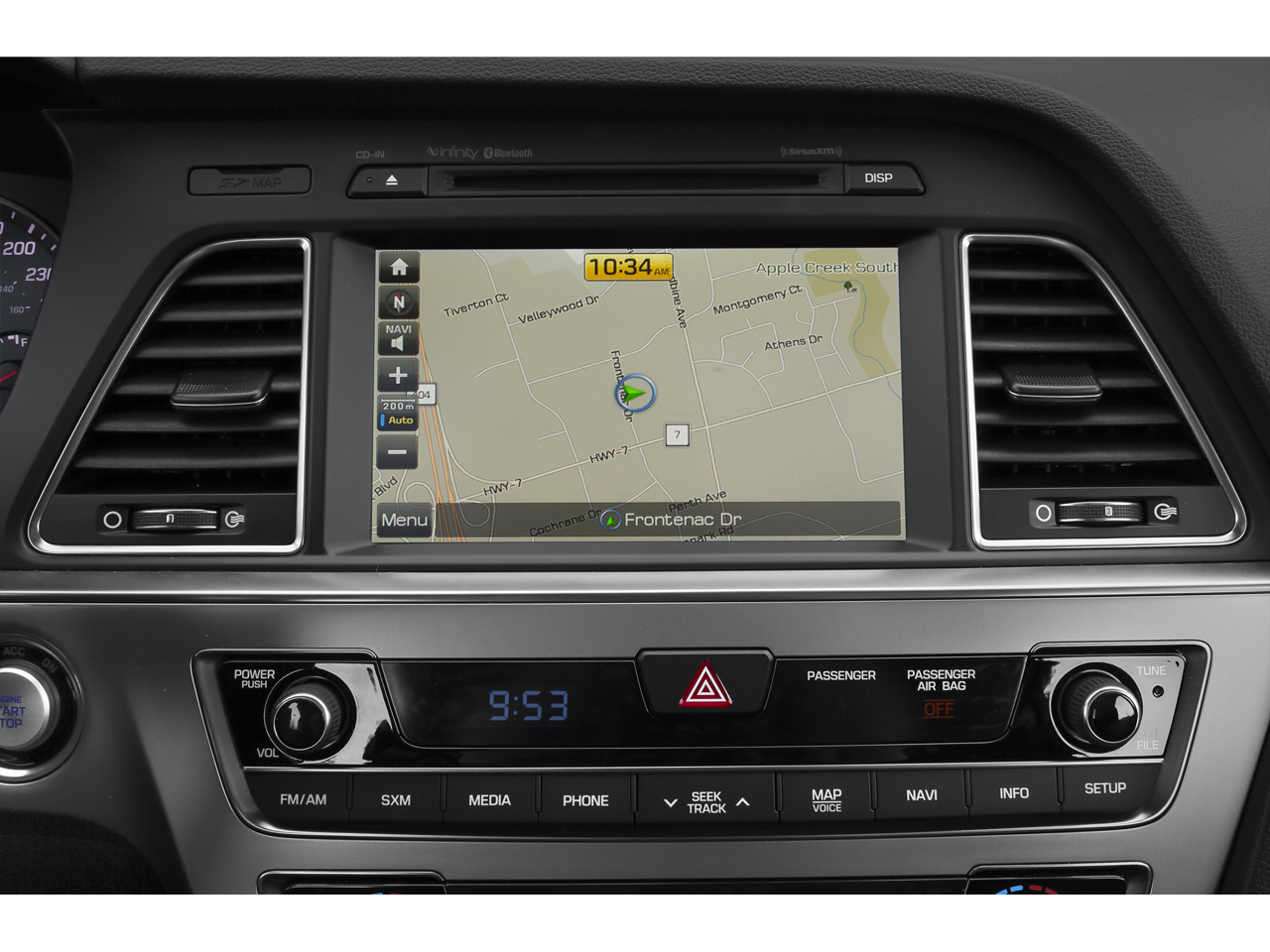 - Radio: AM/FM/SiriusXM/CD/MP3 w/Navigation -inc: iPod/USB and auxiliary inputs, 6 speakers (2 front-door-mounted, 2 tweeters, and 2 rear), 8-inch color touchscreen, HD Radio technology, Infinity premium speakers w/subwoofer and external amplifier and SiriusXM Travel Link (complimentary trial)